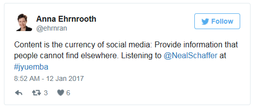 But what was the key message from Neal Schaffer? In the Twitter era it is possible to see how the participants experienced the event. As we know, there is always creativity and power on the both side: writer does her/his part and reader her/his; key note speaker does her/his part and participant has her/his role to play. This same phenomenon is present everywhere, for instance in every strategy session someone presents ideas and each participant interprets the message on their own way and everyone makes a decision how to continue from there.