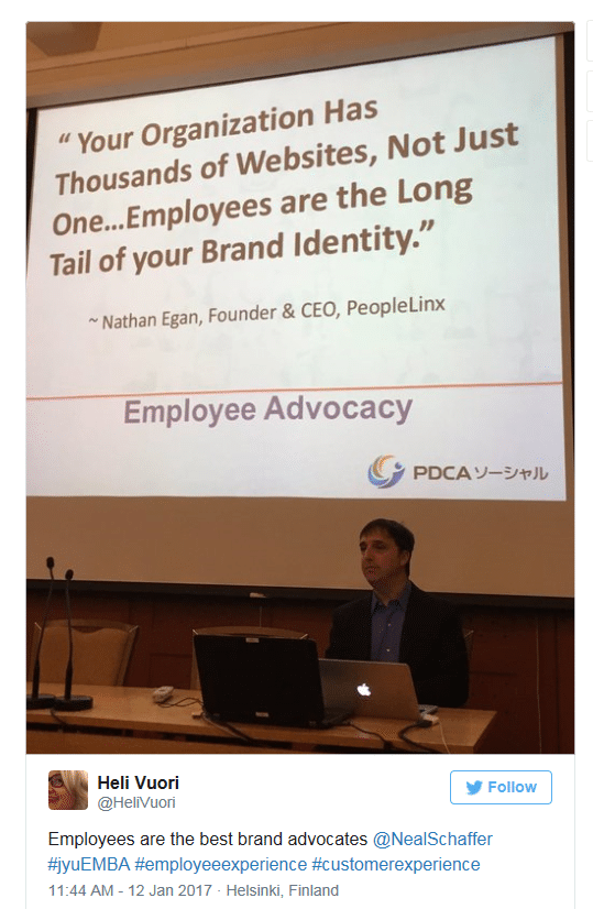 It can be said that the concept of Voice was strongly present in Neal’s presentation. He talked about the importance of developing a distinctive visual voice for every company. He also talked about the voice which we all have, and the voice which every employee possesses. Different platforms are powerful loudspeakers and hence it is vital how people decide to use their voice in the Twitter era. The concept of Employee Advocacy merits a close attention.