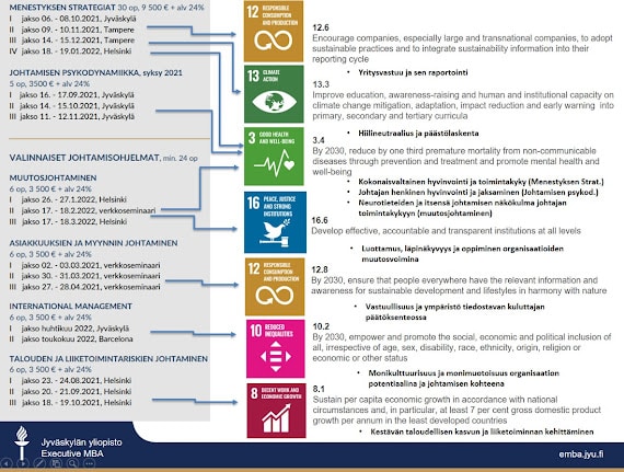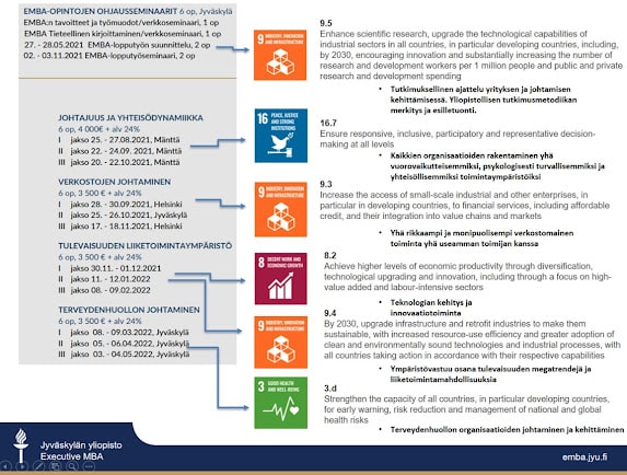 Tämän kirjoituksen alla on havainnollistettu EMBA-ohjelman sisältöjä suhteessa YK:n kestävän kehityksen SDG-tavoitteisiin (Sustainable Development Goals). Oheinen esitys kuvaa tilannetta kuluneella lukuvuodella 2020-2021, eli sitä miltä osin kunkin EMBA-kurssimoduulin sisällöt keskeisesti liittyvät noihin tavoitteisiin. Seuraavaan kauteen on syytä ottaa taas seuraavia kehitysaskeleita, vastuullisuusteeman integrointi osaksi EMBA-ohjelmaa ei ole ollenkaan loppuun käsitelty asia.